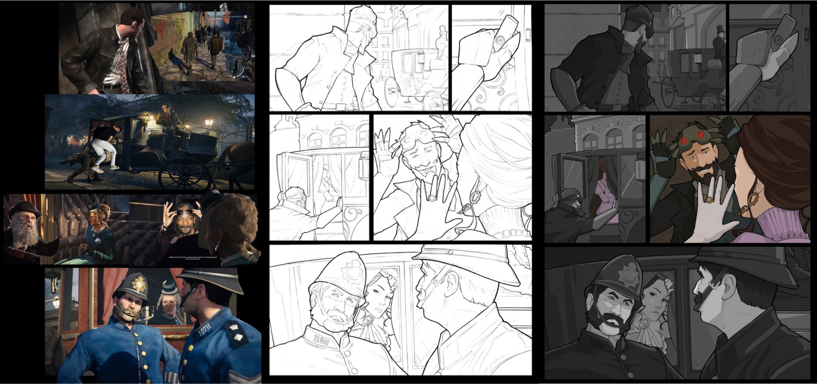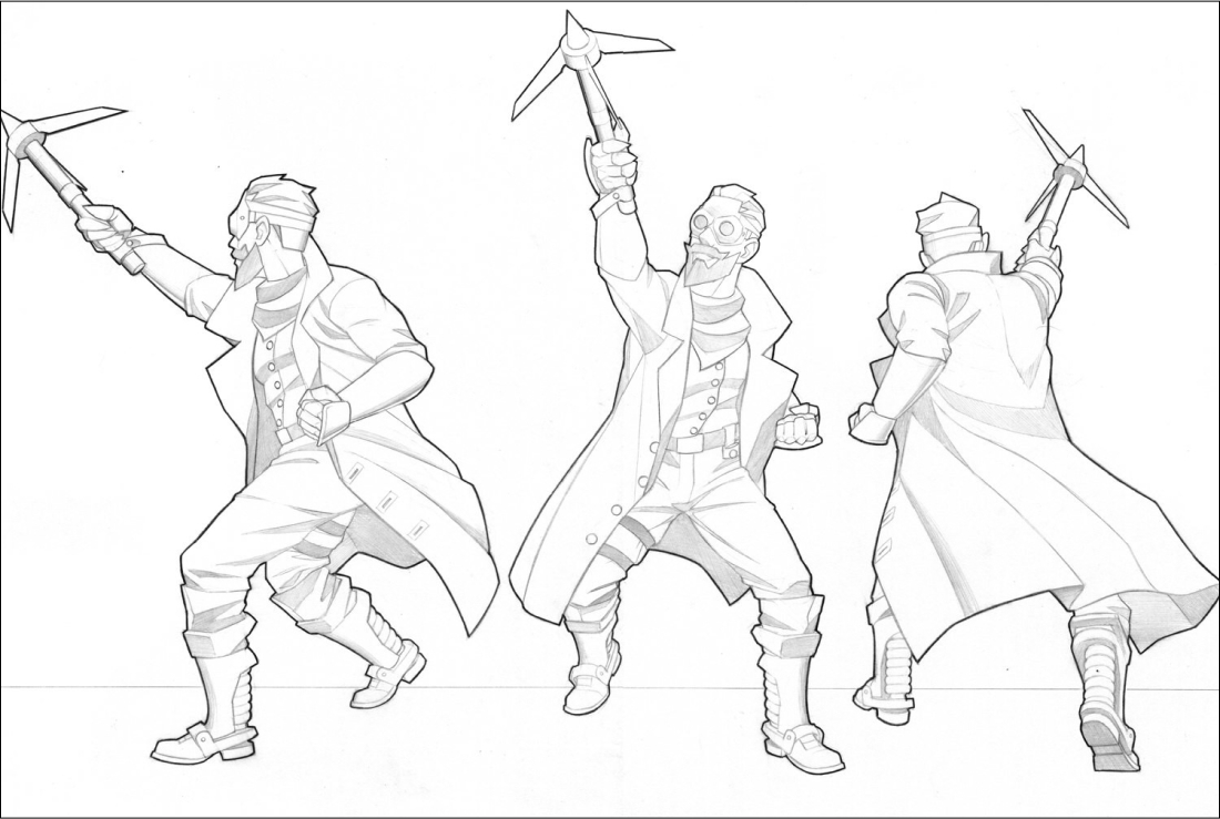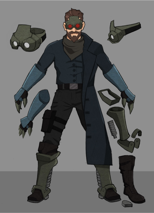 Разработку комикса мы начинаем с главных героев. Важно понять характер персонажей, их образ жизни, мотивы. В этом случае у нас было только текстовое описание героя, его одежды и механизмов, которыми он пользуется. После некоторых итераций мы согласовали концепт. Основные элементы мы позаимствовали из оригинальной истории: